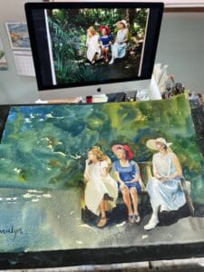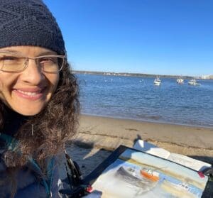 Warm enough to paint outside, I packed early for Seabrook, New Hampshire. Near the border of Massachusetts, Seabrook is renown for roughness. The half block deserted beach held several tantalizing lobster boats close to shore.